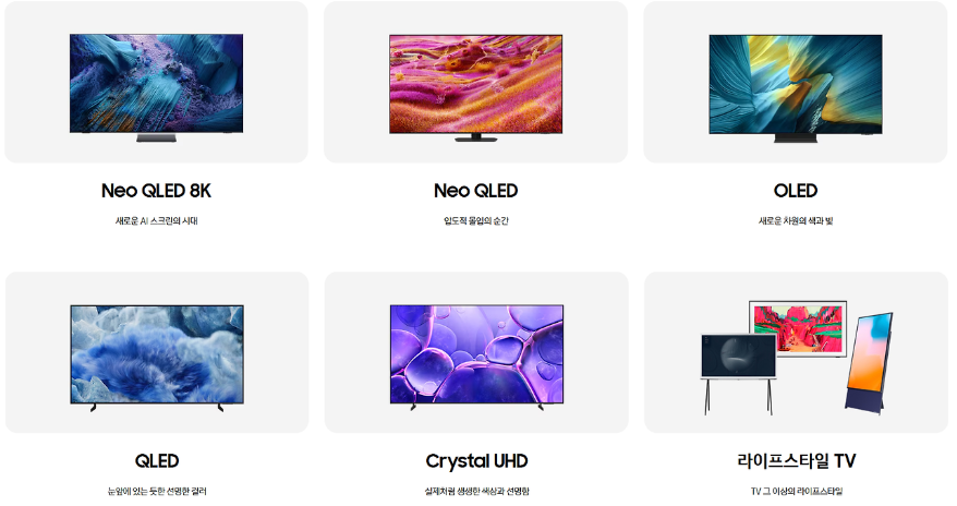 Crystal UHD, QLED, Neo QLED, OLED, QD-OLED 같은 다양한 기술이 공존하며