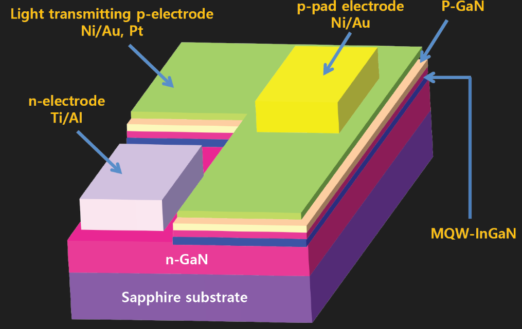 - 그 위에 GaN을 키워 LED 칩이 만들어집니다.
