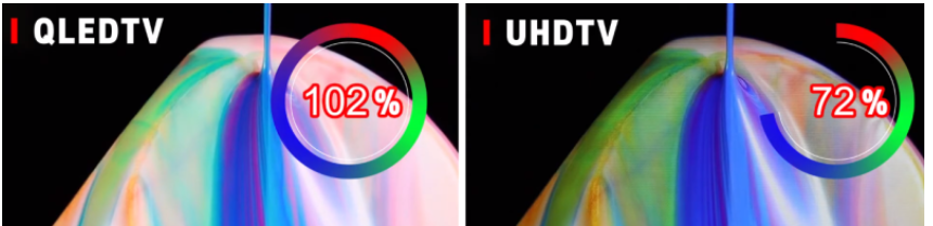 QD TV는 기존 LCD(UHD TV)보다 훨씬 넓은 색 영역을 표현합니다.