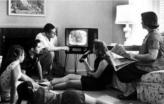 브라운관 TV 앞에 가족이 모여 앉아